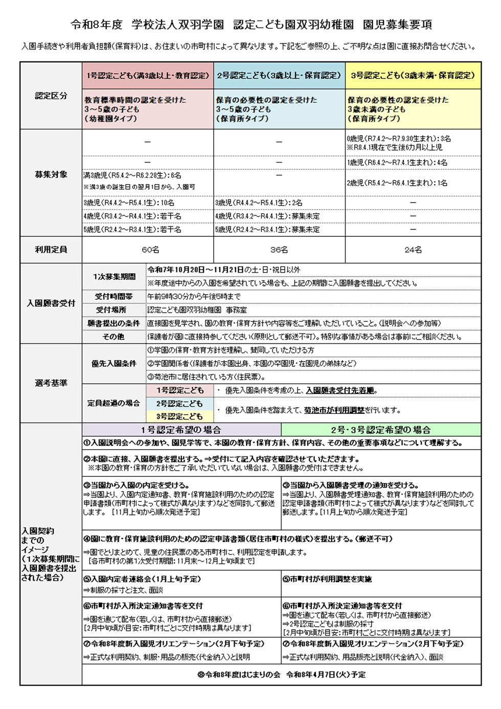 - ※入園の申し込みにあたっては、入園説明会に参加されるなどして直接園を見学され、園の教育・保育方針や内容等をご理解の上、入園願書を提出してください。また、入園願書は、お子様同伴で直接園に持参してください(原則として郵送不可)。
